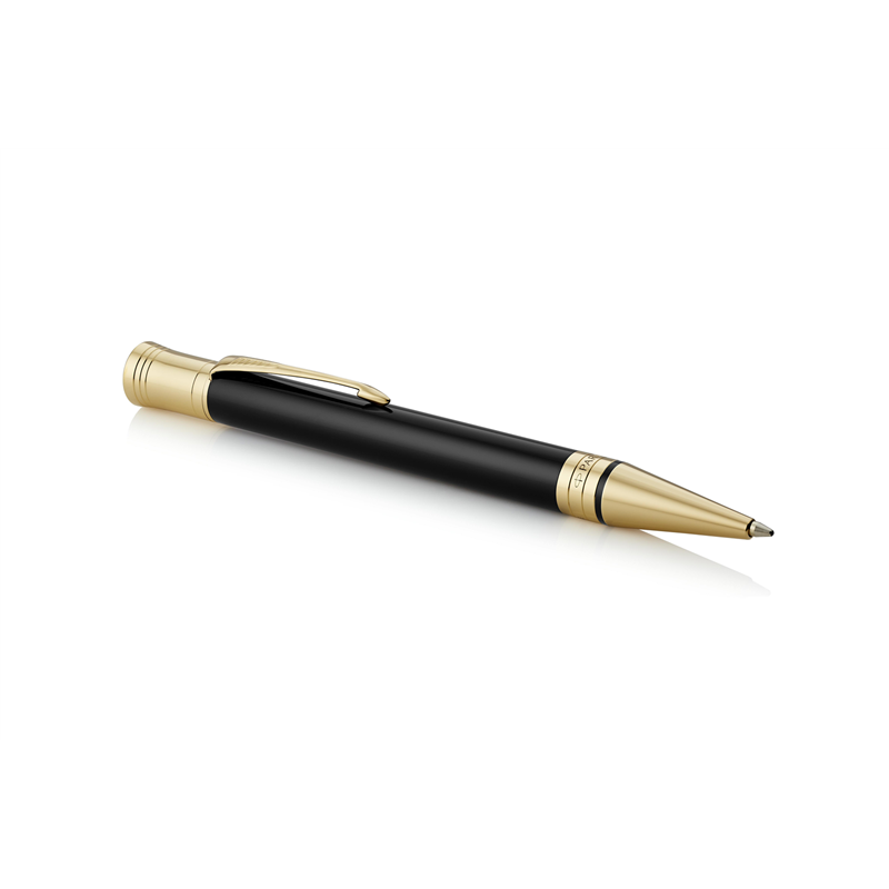 duofold classic blackemblema della tradizione parker di alta artigianalità dal 1921fusto in pregiata resina nera vellutata con finiture placcate oro 23 caratimeccanismo a rotazione retrattilepunta a sfera media- inchiostro neropresentata in una lussuosa confezione regalo