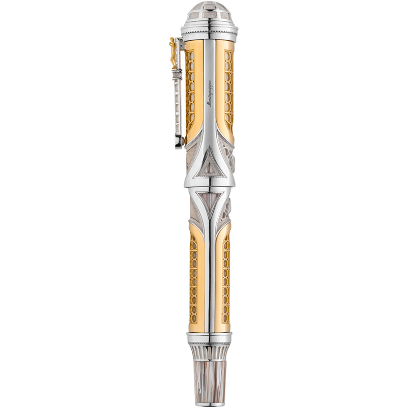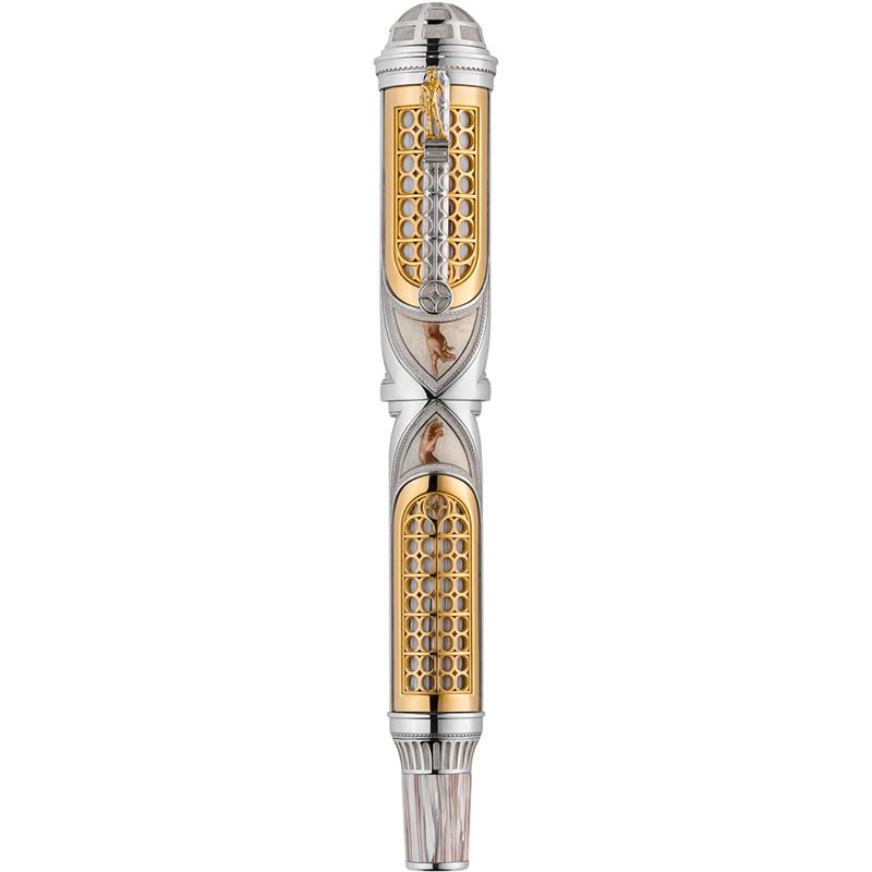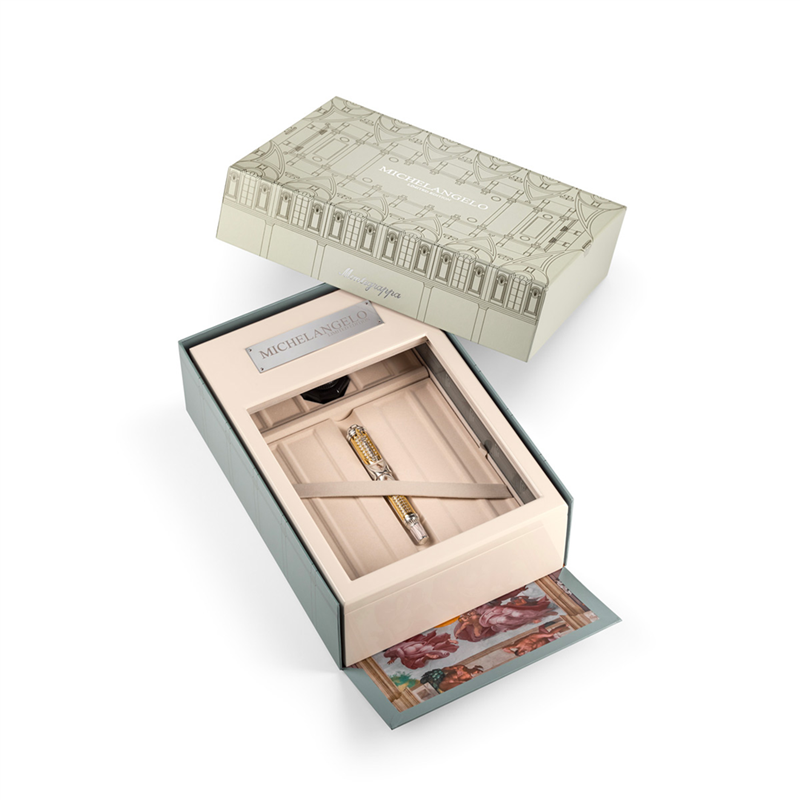 "nel 550° anniversario della nascita di michelangelo buonarroti, montegrappa celebra il maestro assoluto del rinascimento con una creazione ispirata alle sue opere. architettura, pittura e scultura si esprimono in un design che rivista il genio creativo di michelangelo in un objet d'art, espressione del più alto artigianato italiano. una spettacolare fusione a cera persa riproduce la struttura architettonica delle finestre della cappella sistina, in maniera speculare sul fusto e sul cappuccio, creando l’alloggiamento ideale per l’esclusiva decorazione, dipinta a mano, della creazione di adamo. sulla sommità del cappuccio, la cupola-lucernario della tribuna della galleria dell’accademia di firenze accoglie la miniatura in microfusione del david posta sulla clip: simbolo del coraggio e dell’intelletto che vincono sulla forza. caratteristiche : materiali: resina montegrappite, oro giallo 18k, argento 925pennino: oro 18k packaging: specialecaricamento: pistone minuterie: argento 925 accessori inclusi: boccetta inchiostro (50ml) misure: lunghezza: 150.00 diametro: 22.00 peso: 116.00"
