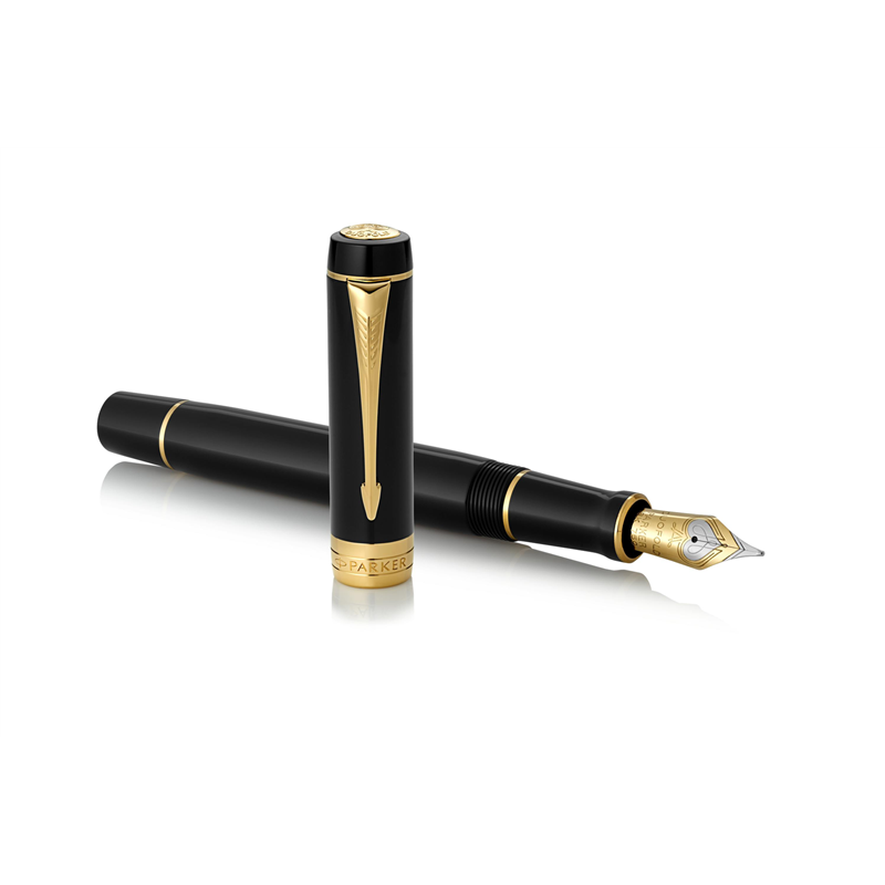 caratteristicheemblema della tradizione parker di alta artigianalità dal 1926penna stilografica centennial size con corpo, cappuccio e pennino più grandiserbatoio in pregiata resina nera vellutata con finiture placcate in oro 23 caratipennino bitonale in oro massiccio 18 carati, rodiatopennino fine, inchiostro nero