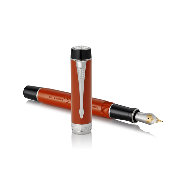 duofold classic big red vintage pennino medioemblema della tradizione parker di alta artigianalità dal 1924penna stilografica centennial size con corpo, cappuccio e pennino più grandiserbatoio in pregiata resina nera vellutata con finiture placcate in oro 23 caratipennino in oro massiccio 18 carati, rodiato bitonalepennino medio inchiostro nero