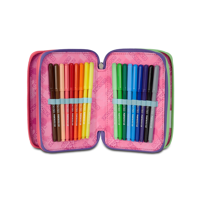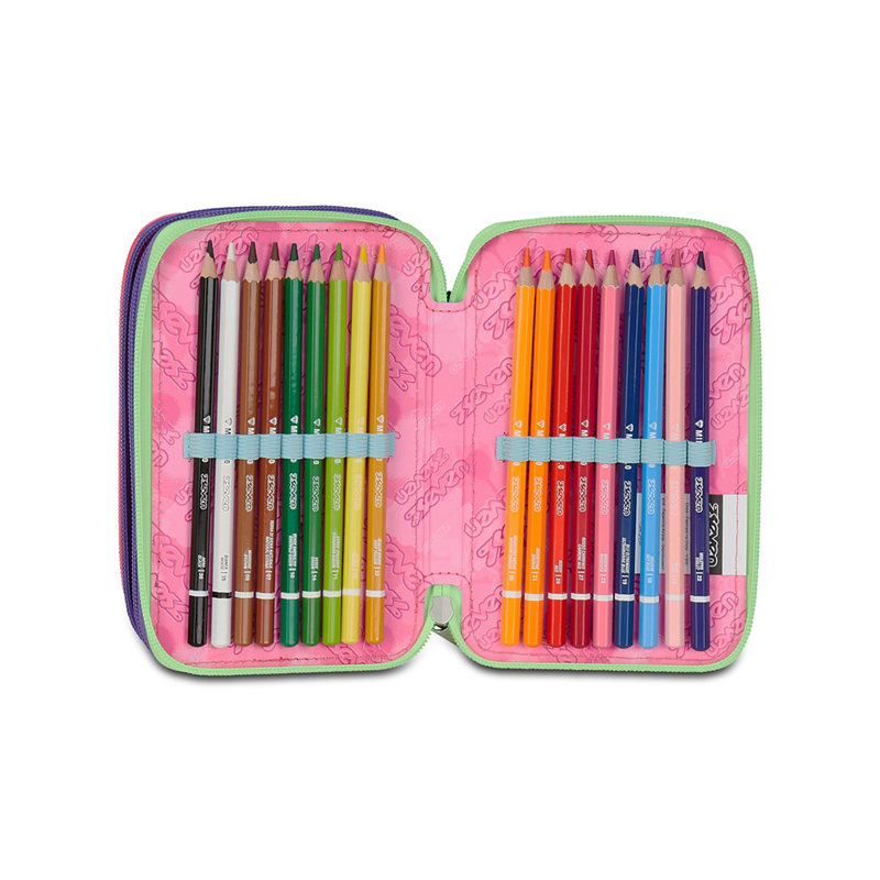 Questo astuccio Seven 3 zip ha tre scomparti in cui troverai tutto il materiale necessario per la tua giornata di scuola. A te non resta altro che abbinarlo a uno zaino o trolley Seven. DIMENSIONI: 12,5 x 20 x 7 cm TASCHE: Triplo scomparto ALTRE CARATTERISTICHE: CONTENUTO 45 PEZZI: 1 penna cancellabile blu, 1 penna sfera rossa, 18 pastelli a colori 4.0 esagonali, 18 pennarelli superlavabili punta 3.0, 1 matita grafi te esagonale HB, 1 colla gialla azzurra, 1 gomma bianca con cartoncino stampato, 1 temperino barilotto 2 fori, 1 righello trasparente, 1 matita bicolor rosso/blu, 1 paio di forbici in metallo TESSUTO: Poliestere