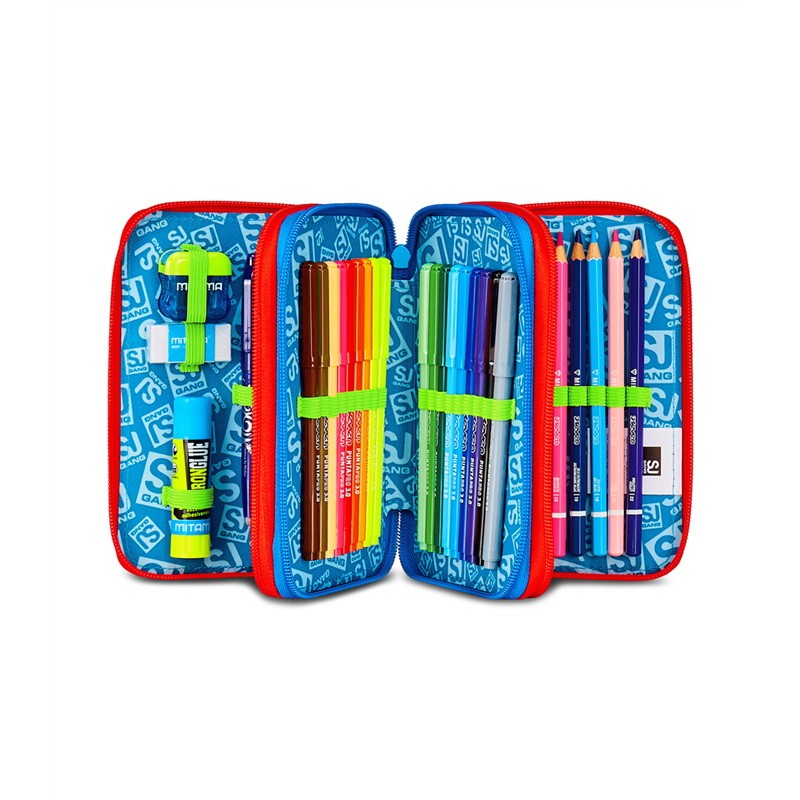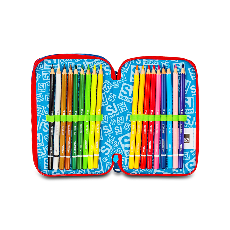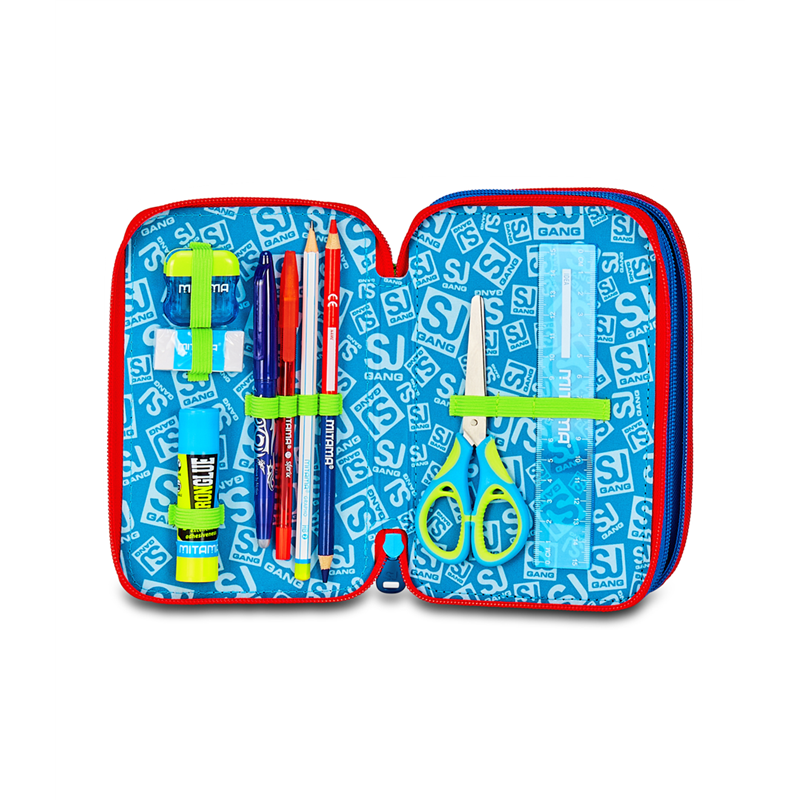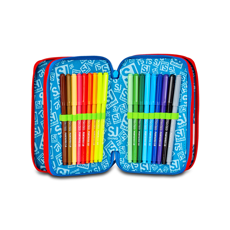 Ciao! Sono il coloratissimo Astuccio 3 zip SJ Gang. Dotato di 3 scomparti completi di tutto il materiale necessario per fare al meglio i tuoi lavori di scuola, puoi abbinarmi a uno zaino o a un trolley SJ Gang. DIMENSIONI: 12,5 x 20 x 7 cm TASCHE: Triplo scomparto ALTRE CARATTERISTICHE: CONTENUTO 45 PEZZI: 1 penna cancellabile BLU, 1 penna sfera rossa, 18 pastelli a colori 4.0 esagonali, 18 pennarelli superlavabili punta 3.0, 1 matita grafite esagonale HB, 1 colla gialla azzurra, 1 gomma bianca con cartoncino stampato, 1 temperino barilotto 2 fori, 1 righello trasparente, 1 matita bicolor rosso/BLU, 1 paio di forbici in metallo TESSUTO: Poliestere