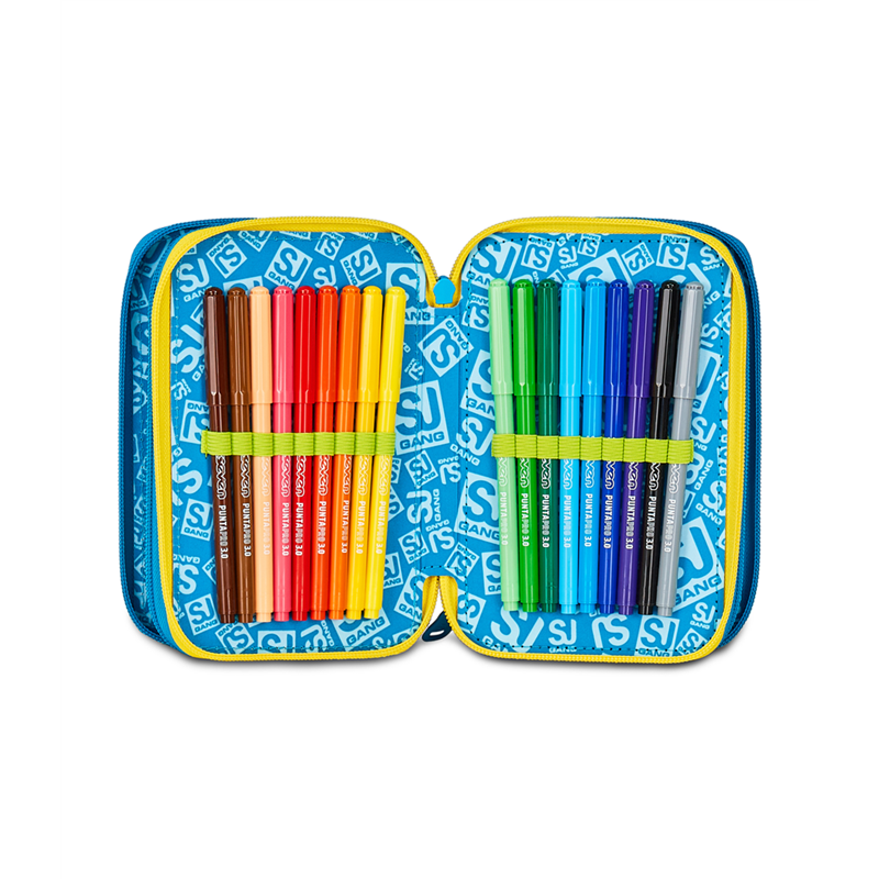 Ciao! Sono il coloratissimo Astuccio 3 zip SJ Gang. Dotato di 3 scomparti completi di tutto il materiale necessario per fare al meglio i tuoi lavori di scuola, puoi abbinarmi a uno zaino o a un trolley SJ Gang. DIMENSIONI: 12,5 x 20 x 7 cm TASCHE: Triplo scomparto ALTRE CARATTERISTICHE: CONTENUTO 45 PEZZI: 1 penna cancellabile BLU, 1 penna sfera rossa, 18 pastelli a colori 4.0 esagonali, 18 pennarelli superlavabili punta 3.0, 1 matita grafite esagonale HB, 1 colla gialla azzurra, 1 gomma bianca con cartoncino stampato, 1 temperino barilotto 2 fori, 1 righello trasparente, 1 matita bicolor rosso/BLU, 1 paio di forbici in metallo TESSUTO: Poliestere