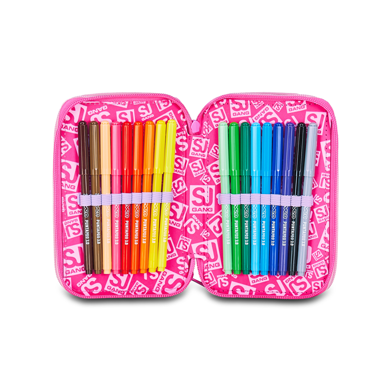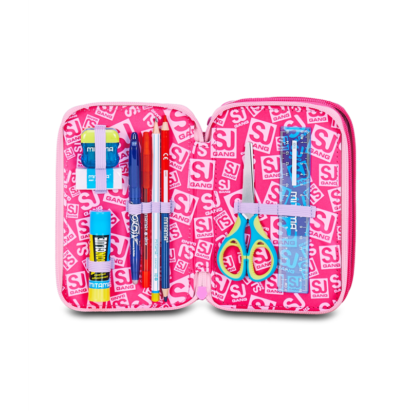 Ciao! Sono il coloratissimo Astuccio 3 zip SJ Gang. Dotato di 3 scomparti completi di tutto il materiale necessario per fare al meglio i tuoi lavori di scuola, puoi abbinarmi a uno zaino o a un trolley SJ Gang. DIMENSIONI: 12,5 x 20 x 7 cm TASCHE: Triplo scomparto ALTRE CARATTERISTICHE: CONTENUTO 45 PEZZI: 1 penna cancellabile BLU, 1 penna sfera rossa, 18 pastelli a colori 4.0 esagonali, 18 pennarelli superlavabili punta 3.0, 1 matita grafite esagonale HB, 1 colla gialla azzurra, 1 gomma bianca con cartoncino stampato, 1 temperino barilotto 2 fori, 1 righello trasparente, 1 matita bicolor rosso/BLU, 1 paio di forbici in metallo TESSUTO: Poliestere