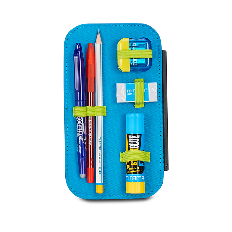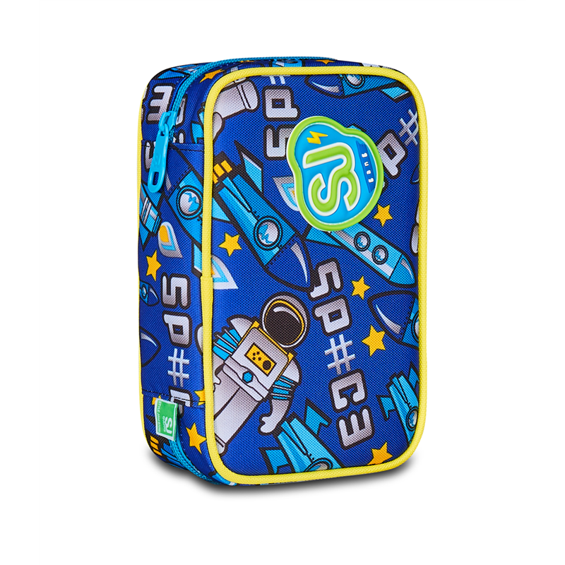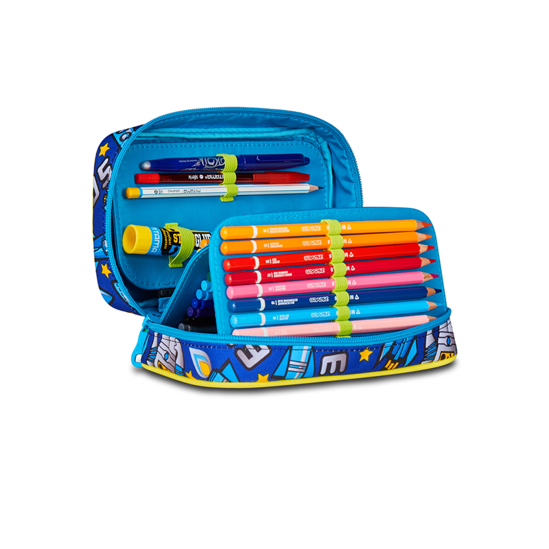 Ciao! Sono l’astuccio Speed Case SJ Gang! Dotato di una comoda apertura tramite un’unica zip e di tutto il materiale necessario per esprimere al meglio la tua fantasia, puoi montarmi e smontarmi a tuo piacere. Infatti, all’interno ho plance removibili con elastici porta penne e matite, che puoi rimuovere del tutto. Così puoi riempirmi come preferisci. Comodo, pratico, versatile e coloratissimo, non ti resta che abbinarmi a uno zaino o a un trolley SJ Gang! DIMENSIONI: 13,5 x 21 x 6,5 cm TASCHE: Tasca interna per cancelleria ALTRE CARATTERISTICHE: Apertura singola tramite zip, plance amovibili, elastici interni per cancelleria. CONTENUTO 44 PEZZI: 1 penna cancellabile BLU, 1 penna sfera rossa, 18 pastelli a colori 4.0 esagonali, 18 pennarelli superlavabili punta 3.0, 1 matita grafite esagonale HB, 1 colla gialla azzurra, 1 gomma bianca con cartoncino stampato, 1 temperino barilotto 2 fori, 1 righello trasparente azzurro, 1 paio di forbici in metallo con maniglia in plastica TESSUTO: Poliestere