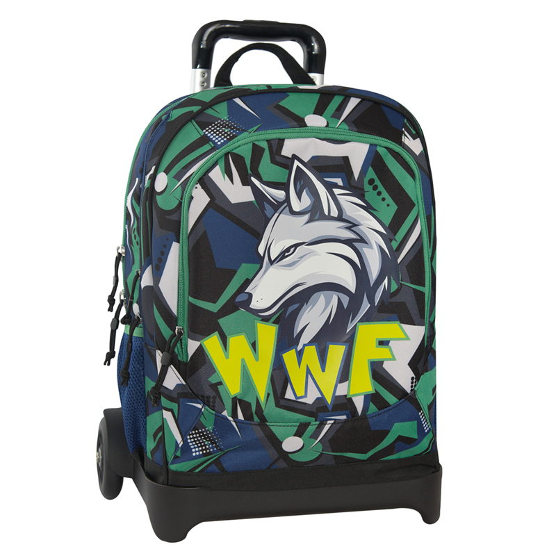 Zaino con trolley staccabile, illustrato con tema lupo, prodotto da Franco Cosimo Panini Editore Spa, in collaborazione con WWF, caratterizzato da un design funzionale e versatile, ideale per l'organizzazione degli oggetti personali.