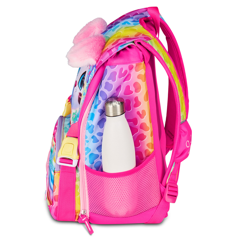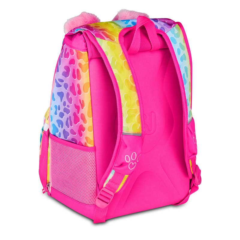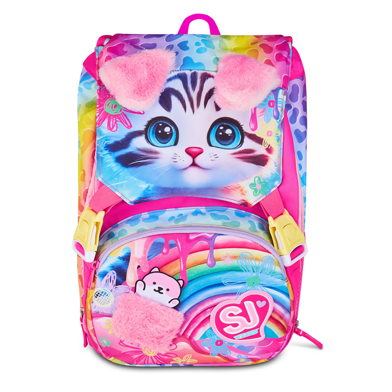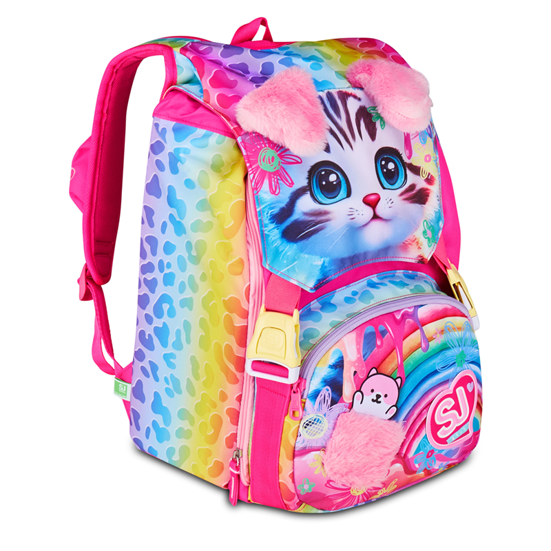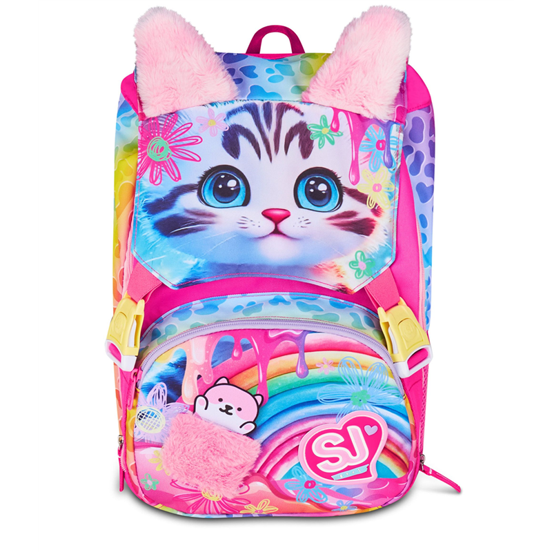 Ciao! Sono CAT&AIR, lo zaino estensibile SJ GANG con cui vai a scuola e con cui puoi giocare facendo sollevare le mie ORECCHIE DI PELUCHE! Ho un doppio scomparto spazioso, di cui puoi aumentare facilmente la capienza tramite le zip laterali per poter accogliere e distribuire in modo ottimale libri, quaderni e tutto ciò che ti serve per la tua giornata, potendo sfruttare anche la tasca frontale con dettaglio taschino e MINI PELUCHE in applicazione. Inoltre, sono davvero comodo da indossare sulle spalle, grazie a schienale e spallacci confortevoli. In più, il fondo integrato mantiene la mia struttura inalterata, garantendo la stabilità del contenuto anche a pieno carico.Schienale: Preformato con fondo integrato. Capacità: 24 lt. Dimensioni: 27 x 39 x 16 cm. Altre caratteristiche: Zaino estensibile tramite zip laterali, orecchie in morbido peluche sollevabili tramite sistema ad aria dagli spallacci a pressione.Dettaglio taschino e mini peluche in applicazione su tasca.Tasche: Tasca frontale, tasca laterale in rete porta borraccia. Spallacci: Imbottiti rivestiti in tessuto e rete, con sagomatura anatomica e inserti rifrangenti.Tessuto: Poliestere. Garanzia 4 anni