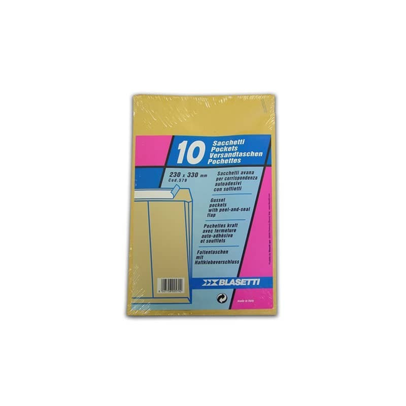Busta Sacco 23x33 cm realizzata in carta Kraft Avana, con una grammatura di 100 g/m². La confezione contiene 10 pezzi. Le buste sono dotate di strip adesivo per una chiusura sicura e soffietti laterali con fondo preformato per una capacità di contenimento maggiore. Marca: Blasetti.