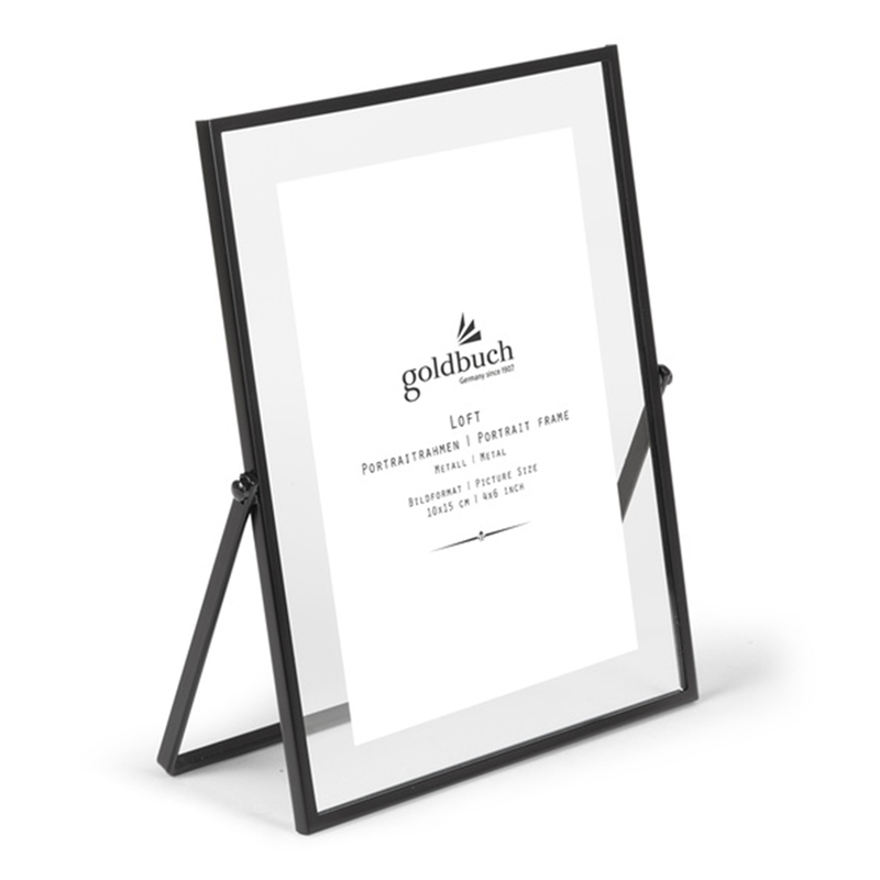 Cornice da tavolo in metallo di dimensioni 10x15 cm, modello Loft Black, realizzata da Goldbuch. Questa cornice presenta un design moderno ed elegante con una finitura nera opaca, ideale per aggiungere un tocco di sofisticatezza a qualsiasi ambiente. Perfetta per esporre foto ricordo o immagini preziose, si adatta facilmente a diversi stili di arredamento grazie alla sua estetica minimalista e versatile.